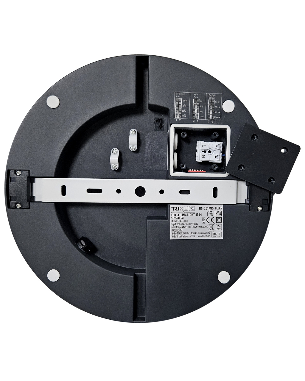 Moderní a výkonné LED CCT stropní svítidlo TR-261MR Trixline - ELLÉS s mikrovlnným pohybovým senzorem poskytuje kvalitní a rovnoměrné osvětlení o síle 2400 lumenů. Nastavitelné CCT umožňuje volbu teplé, neutrální nebo studené bílé barvy světla (3000K/4000K/6500K) pro optimální přizpůsobení atmosféry prostoru. Příjemné a efektivní osvětlení, které splní vaše estetické i praktické požadavky. Svítidlo je vybaveno nastavitelným pohybovým senzorem, který automaticky rozsvítí světlo při detekci pohybu. Pohybový senzor a barva světla se nastavuje na zadní straně světla, po odšroubování zadního krytu pomoci posuvníků. Svítidlo ELLÉS lze instalovat na různých místech díky jeho univerzálním vlastnostem a krytí IP54, které zajišťuje ochranu proti prachu a stříkající vodě.