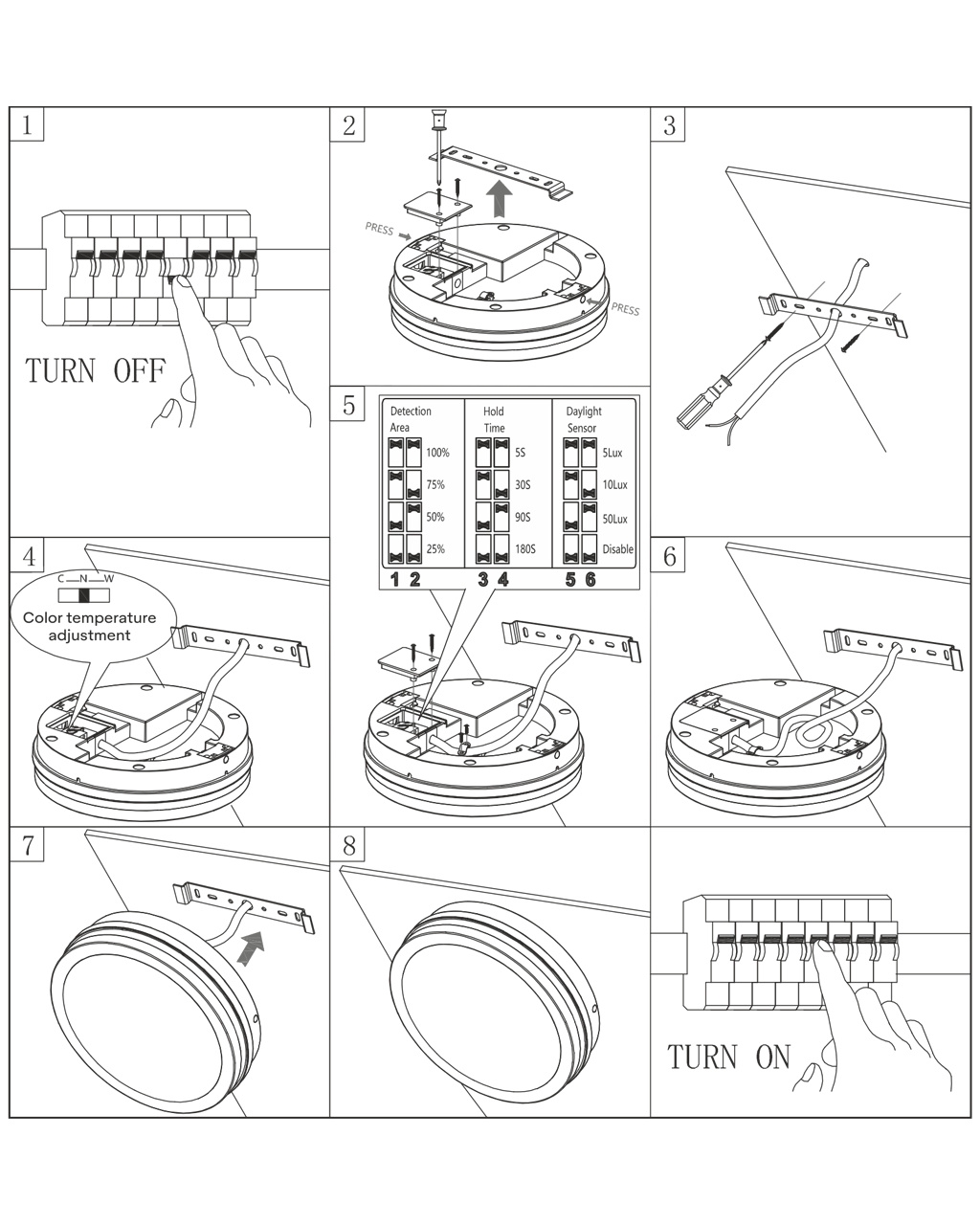 - 50 lux – Světlo se rozsvítí pouze při slabém okolním světle.
