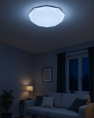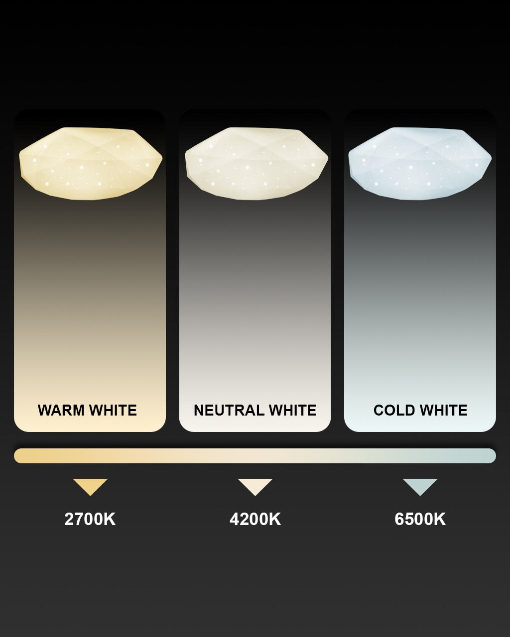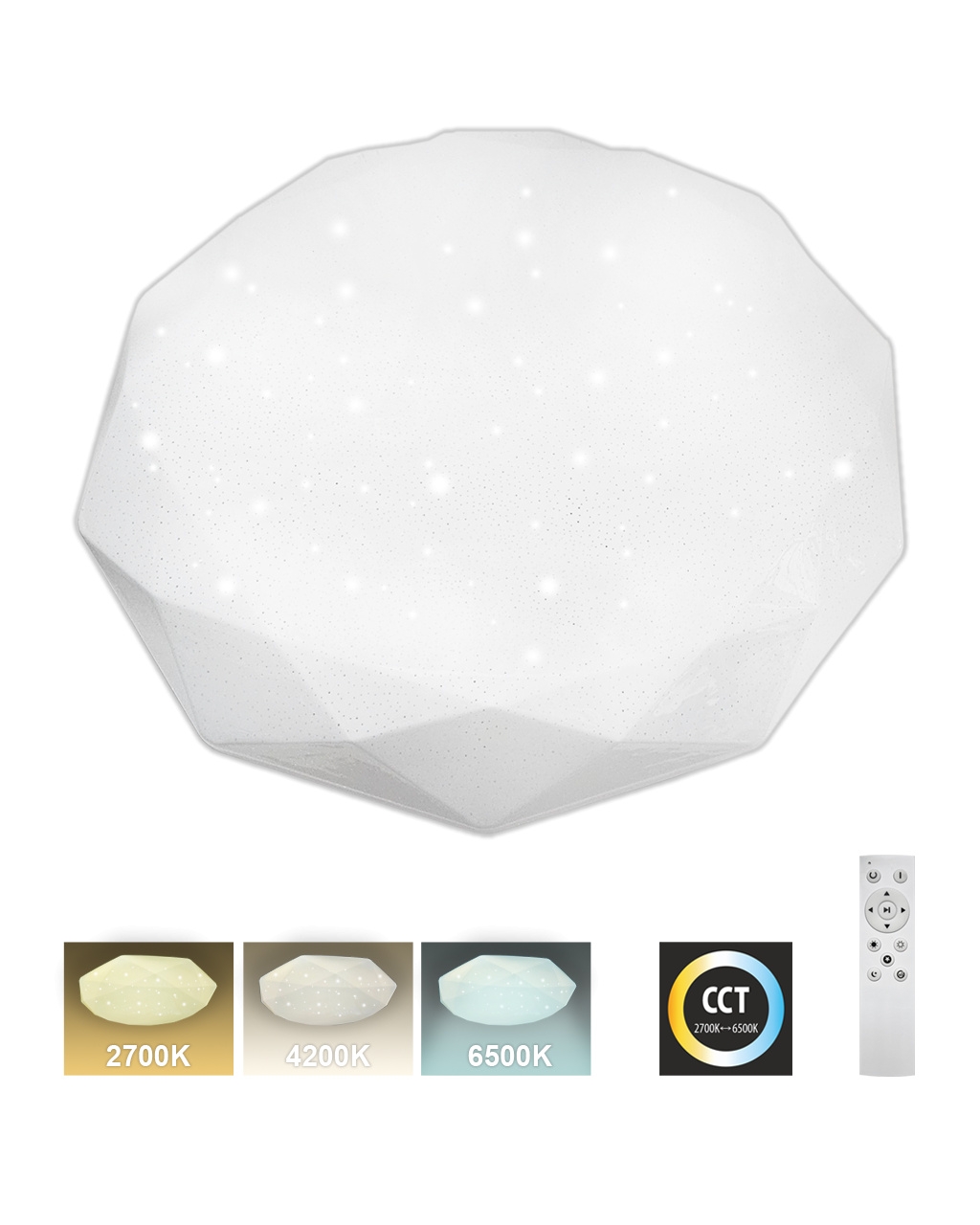 LED stropní svítidlo TR-600C - INDUS v bílé barvě se třpytivým efektem je určeno do vnitřních prostor jako jsou obývací pokoje, ložnice, haly, kanceláře, chodby a podobná místa. Pomocí přiloženého ovladače můžete přepínat mezi třemi světelnými teplotami v rozmezí 2700K až 6500K, které lze stmívat dle potřeby pro navození příjemné atmosféry. Při maximálním ztlumení klesá spotřeba až na pouhých 8W z původních 60W, což zaručuje úsporu energie. Další možností na dálkovém ovladači je i noční režim a funkce 30 vteřin po jejichž uplynutí se LED svítidlo samo vypne. Svítidlo si po vypnutí pamatuje poslední nastavený režim, což zajišťuje pohodlné a intuitivní používání.
